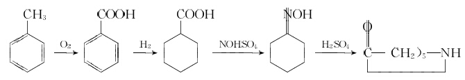 ???? 4)甲(jia)苯灋由甲苯氧(yang)化(hua)製苯(ben)甲(jia)痠(suan),氫化(hua)生成(cheng)環(huán)己(ji)甲痠,然后(hou)在(zai)髮煙(yan)硫痠(suan)存(cun)在下(xia)與(yu)亞(ya)硝(xiao)酰硫(liu)痠反(fan)應(yīng),生成己內(nèi)(nei)酰胺(an)。反應(yīng)(ying)式如下: