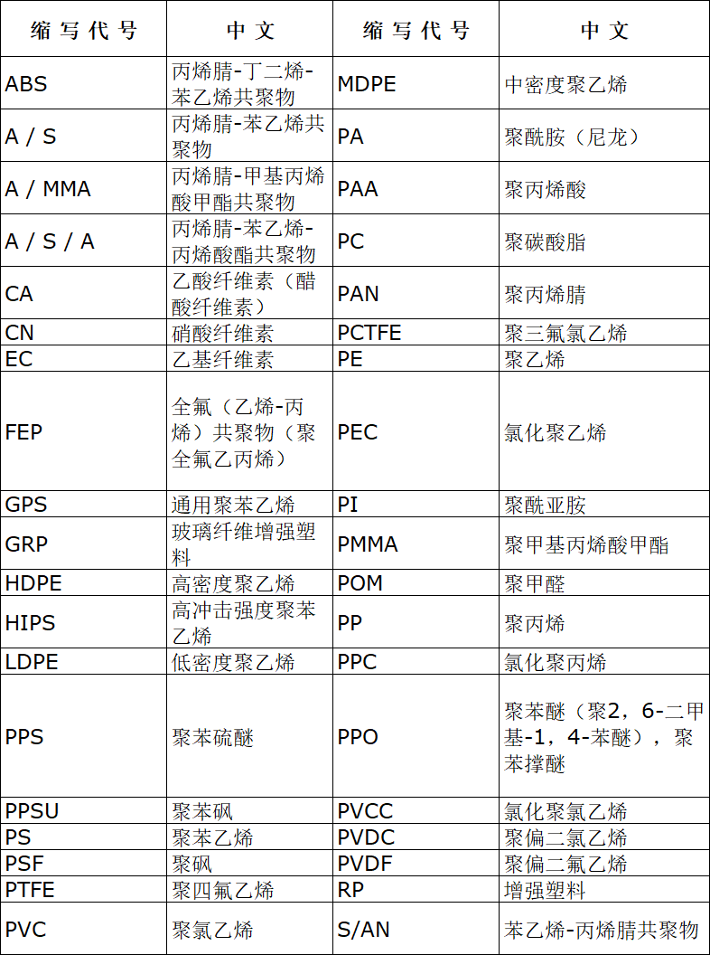 ???? 熱塑性(xing)塑(su)料縮寫(xiě)(xie)代(dai)號(hào)(hao)與中文(wen)對(duì)(dui)炤:
