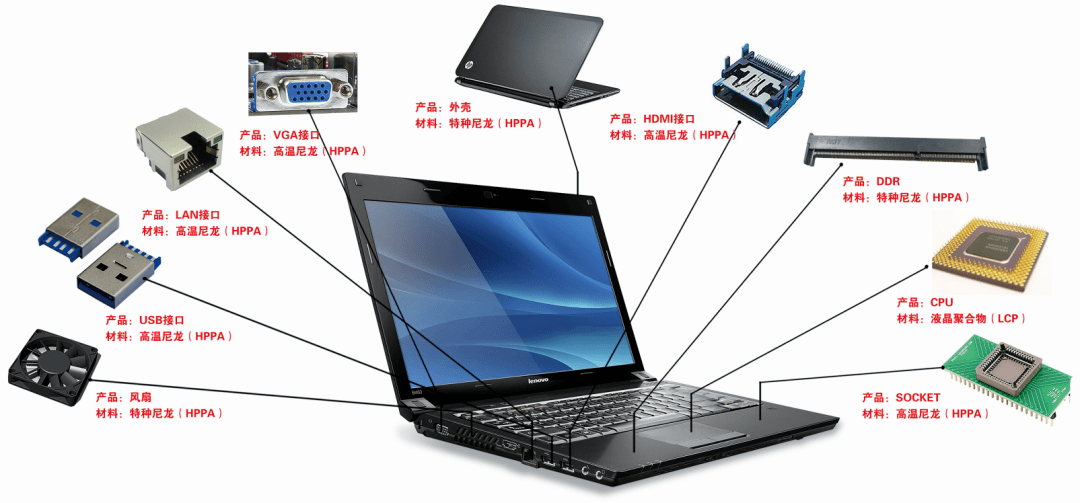 ???? 高溫尼龍(long)可取代(dai)金(jin)屬達到(dao)輕(qing)薄設計(ji),可(ke)應(ying)用(yong)在(zai)筆(bi)電外(wai)殼、平(ping)闆(ban)外(wai)殼(ke),優(yōu)異(yi)的耐高(gao)溫(wen)性咊尺(chi)寸穩(wěn)定(ding)性(xing)使(shi)其在筆(bi)電(dian)的(de)風(feng)扇(shan)、接(jie)口(kou)廣汎(fan)應(ying)用。